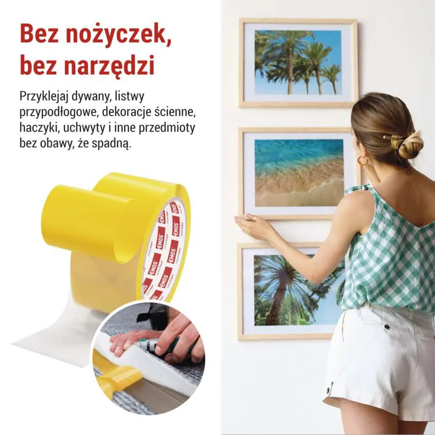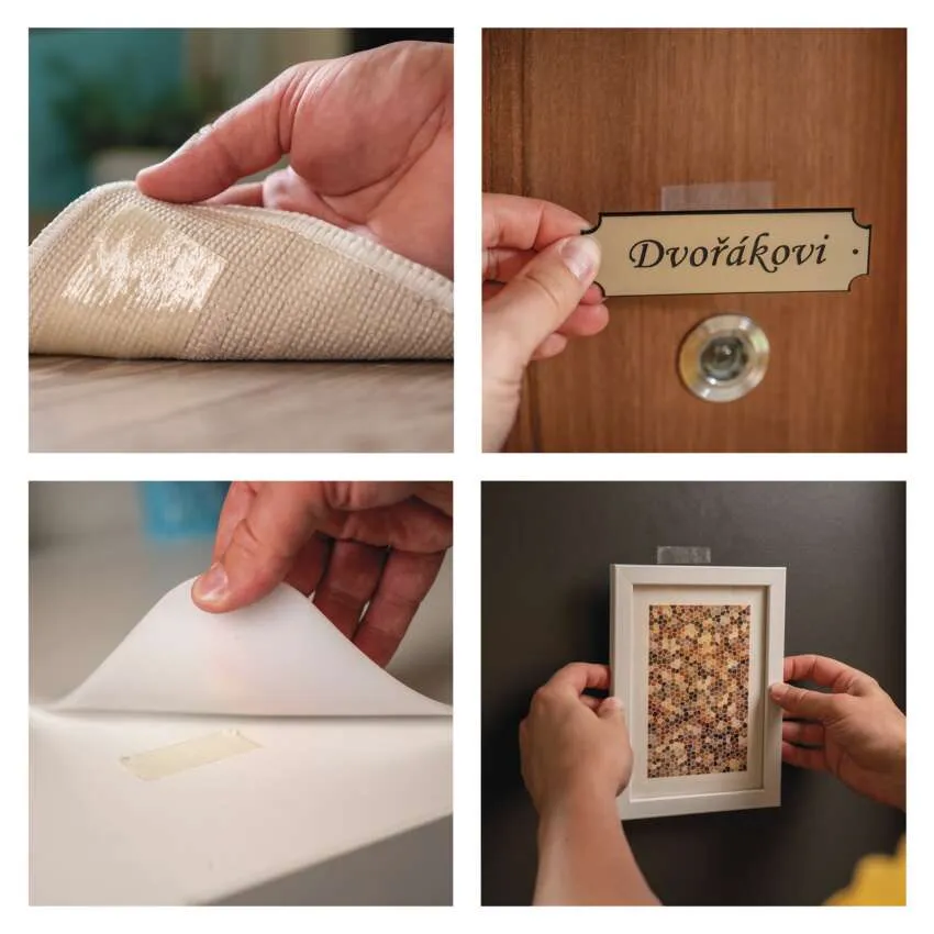 - Taśma jest idealna do mocowania dywanów, listew przypodłogowych, dekoracji ściennych, haczyków, uchwytów i innych przedmiotów, które należy bezpiecznie zamocować bez ryzyka przesunięcia lub upadku.