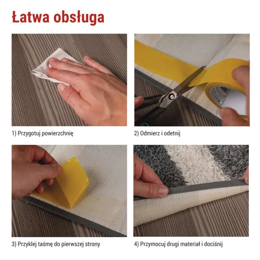 - Wystarczy przygotować i oczyścić powierzchnię, odmierzyć i odciąć potrzebną długość, przykleić taśmę do pierwszego materiału, a następnie przyłożyć drugą powierzchnię i mocno docisnąć.