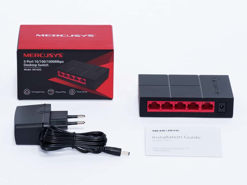 - Zawartość opakowania: switch MS105G, zasilacz, instrukcja szybkiej instalacji