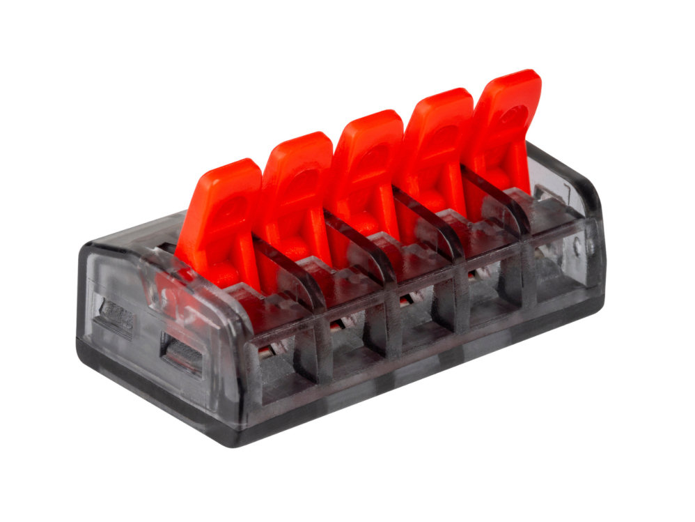 - Montaż wtykowy do maksymalnie 5 przewodów typu linka, jednodrutowych i wielodrutowych